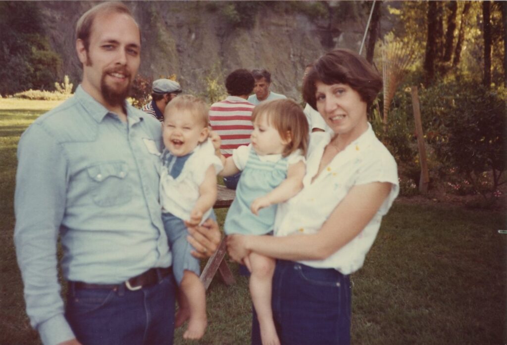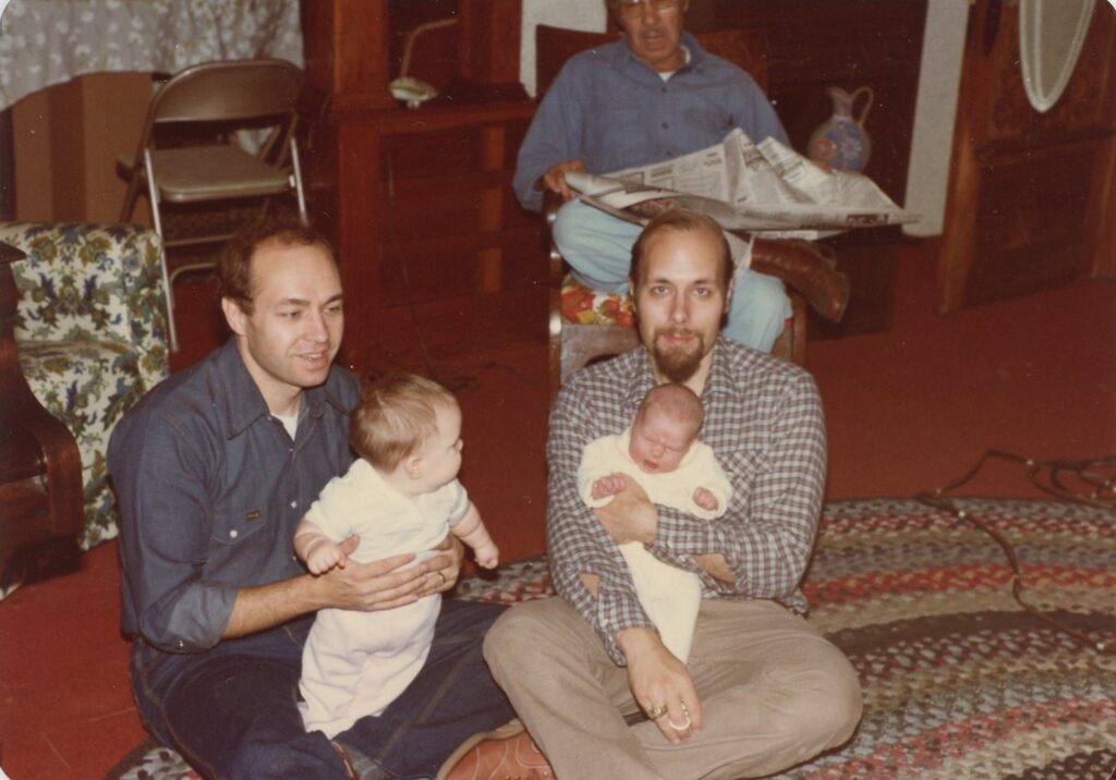 On the left, Tom is holding Nicole Moser, and on the right, Todd is holding Mary Helen Moser. In the background is our father, Carl Moser, watching his sons and granddaughters. The photo was taken at Aunt Virginia’s home in Warm Beach, circa 1981.