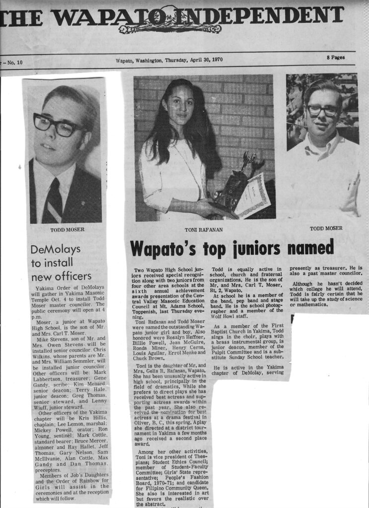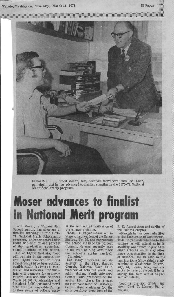 Following graduation from WHS (class of ’71), Todd went to work at the new McDonald’s in Yakima (S. 1st Street) as the morning opener, which consisted of 75 tasks that required his attention before serving Big Macs to the general public. He also learned to work the grill, dress buns, and make milkshakes and fries. He retired from McDonald’s in mid-August 1971 to begin studying at MIT. This marked the end of his career in the fast food industry.