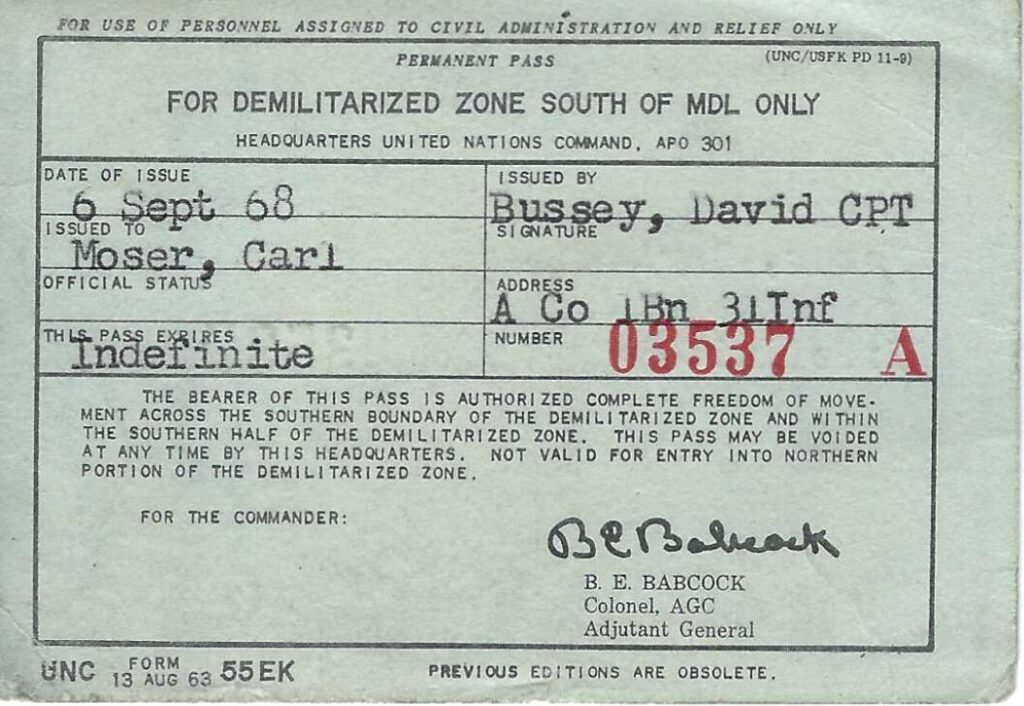 I’m not sure what I was supposed to do with an ID card in the DMZ, but I had one. Notice it says “Headquarters United Nations Command,” and it is only valid south of the Military Demarcation Line, which was an unmarked area of no-man’s land.