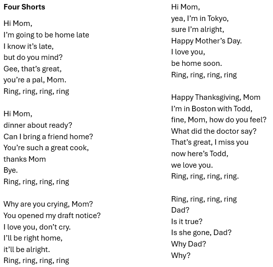 We had a party line in Wapato in 1972, which meant you didn’t answer the telephone except when it was your ring. Our phone number was GL35902 (don’t ask me how I remember that), and our ringtone was four short notes. Neighbors had other rings that we ignored. Some notes were long and others were short, making for a combination of rings to accommodate several families on the same “phone line.” I wrote this poem at George Washington University after learning Mom had died following surgery. Dad called me at the dormitory and left a message with my roommate, Peter Gormley, who found me on campus and informed me that I needed to call home. The last four rings are me calling home to confirm her passing. The call home from Tokyo was when I was in the Army, and the call from Boston was during a visit to Todd at MIT during Thanksgiving.
