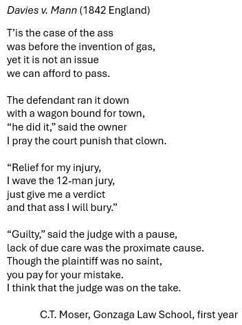 Professor A. Robert Southwell taught tort law to first-year students at Gonzaga Law School. A foundational case in tort law is Davies v. Mann, a decision in English Common Law from 1842, which established the “last clear chance doctrine” in negligence law. Gonzaga employed the Socratic method of instruction, where students were randomly selected to recite the facts and law of a particular case and respond to questions from the professor. The students were expected to prepare for class, anticipating that it would be their turn to recite the case being studied that particular day. I came to class with this poem, and, of course, I was called upon to recite it. Professor Southwell was a man of good humor, as were my classmates when they heard my poem.