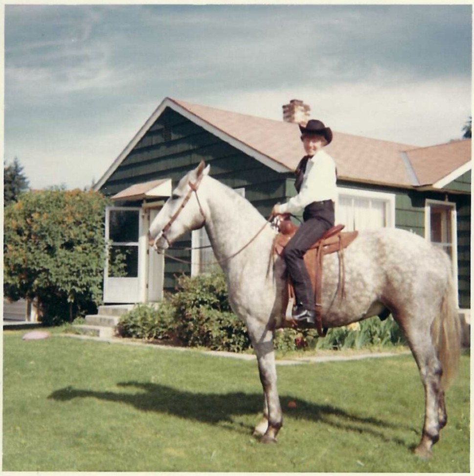 Debbie on Rowdy, a horse she purchased for $45 with babysitting earnings. The photo was taken when her family lived on Pine Street in Colville, which was within walking distance of her grandparents' Tedrow farm, where she kept the horse.