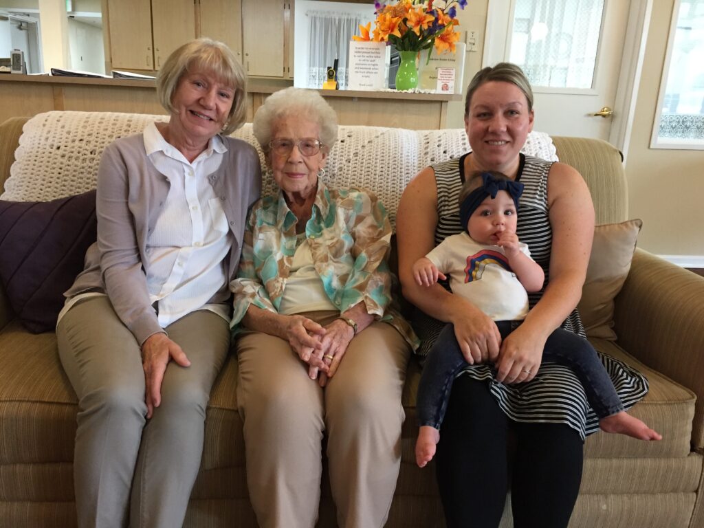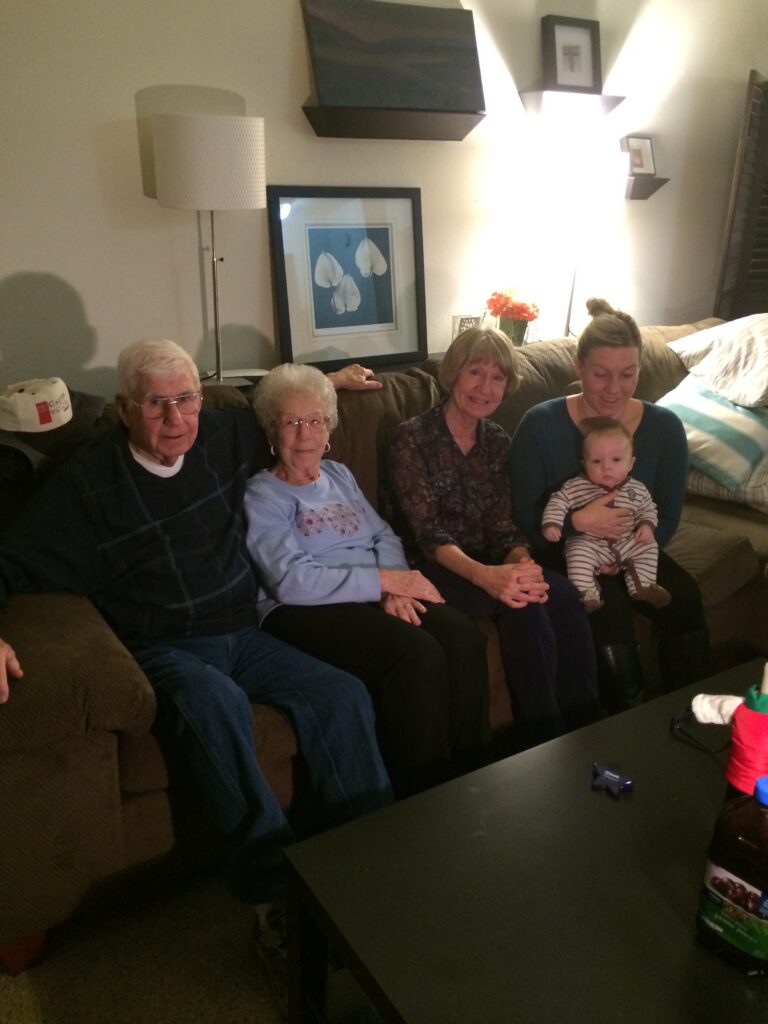 Debbie, Sharon, Nicole, Hensley. Hensley's first meeting with Great-grandma St. Clair.