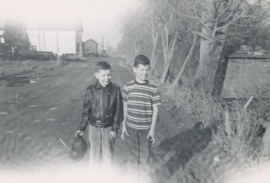 Most of the Moser family was located in the Puget Sound area while my brother and I were growing up in the Yakima Valley. In this photo (circa 1957), I am on the left, next to my cousin Rick Moser, standing on the road along the Snohomish River, where Rick’s family operated a dairy farm.