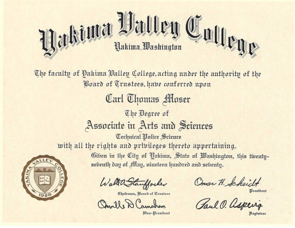 I had to apply for readmission to YVC and appear before the same faculty committee that had denied my application to continue my student tenure in 1967. They saw that I was a different person and gave me a second chance. I started classes in the fall with new energy and focus, fully aware that this could be my last opportunity to become a college graduate. I declared my major in law enforcement, performed well, and obtained an AA degree in Technical Police Science in May 1970.