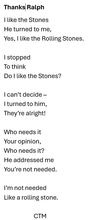 No memory from this author about Ralph and the reason for our apparent conflict. The poem is undated, so I cannot put it in a frame of reference. I have to think that the “Thanks” to Ralph is an expression of sarcasm.